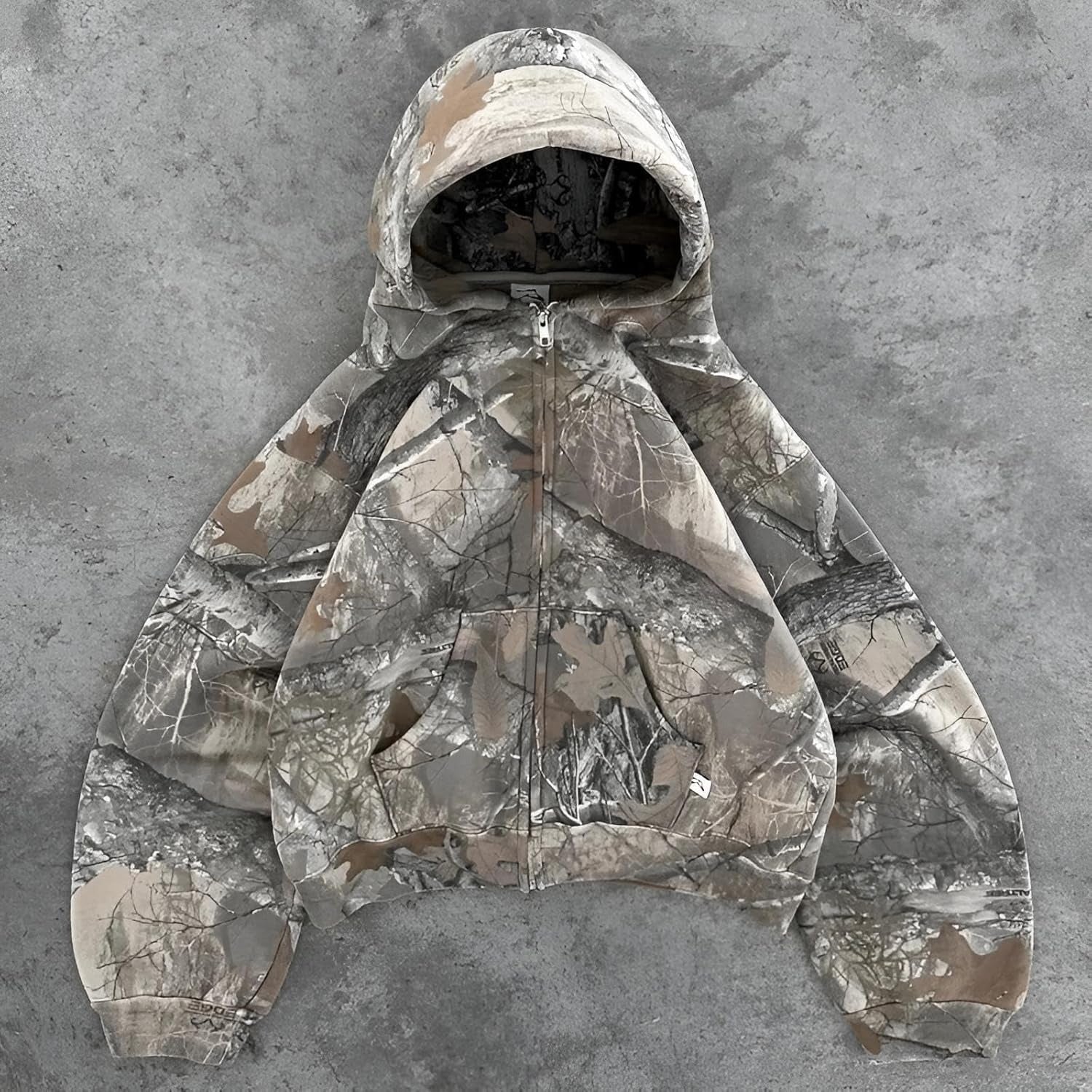 Questa felpa mimetica con cappuccio non è solo un capo streetwear, ma un manifesto di stile: la texture camouflage all-over richiama la libertà degli spazi aperti, reinterpretata con un’anima urbana.